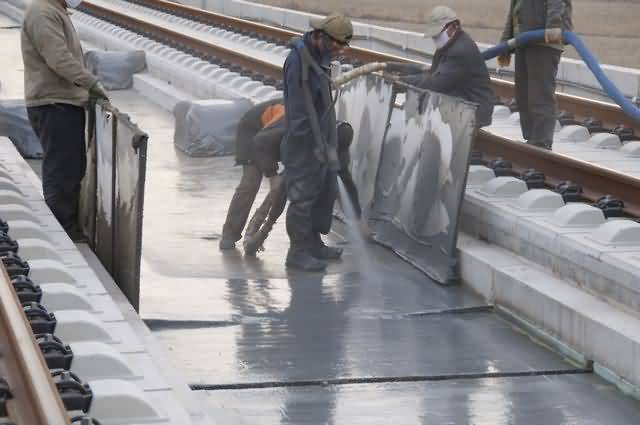該工程分北京、廊坊、天津三段,六個(gè)梁場同時(shí)施工。全線做防水處理的面積超過
