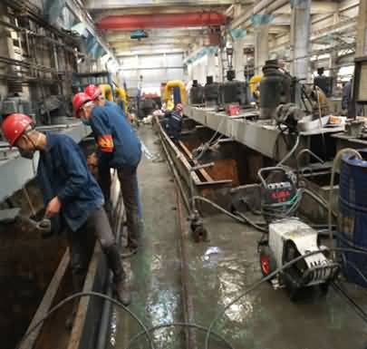 ② .NPT-16-30耐磨修復材料按比例混合,用專用噴涂機對浮選槽底部進行噴涂處理;