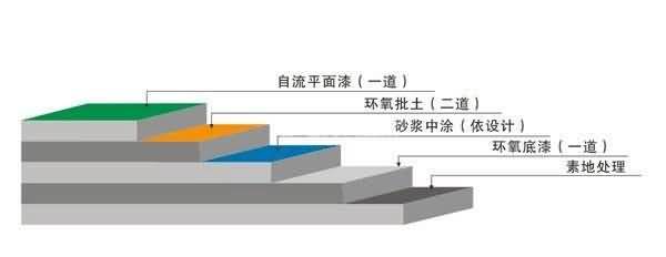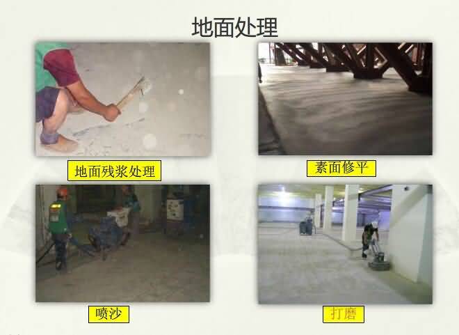1.素地處理:①基礎素地以水泥粉光面或磨石地為準;②素地需養生28天以上,水份需8%以下方可施工素地如有不平或空鼓需加以除去;③用環氧砂漿補平地面;④素地之油污需澈底清洗干凈;⑤施工前需保持施工素地之干燥和清潔;