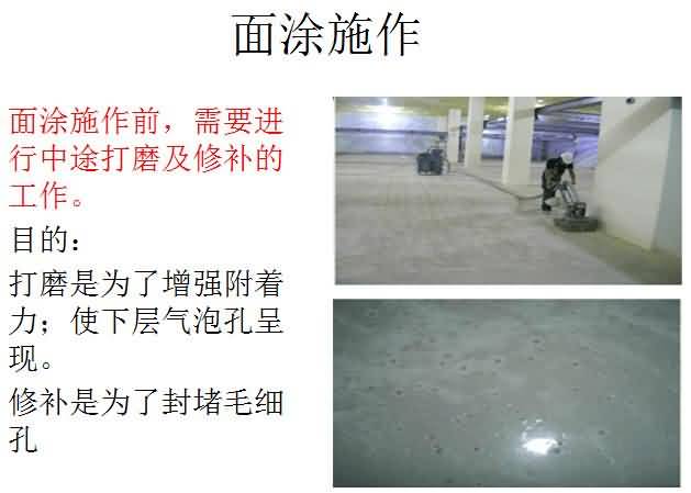 5.面涂層:①施工前需保持干凈如有雜物粘附需清除;②使用前主劑先攪拌均勻;③依照正確比例將主劑及硬化劑混合,充分攪拌;④使用滾筒或鏝刀將材料均勻涂布混合完成材料需30分鐘以內施工完成;⑤施工交接處需做好交接處理;⑥施工完成后,24小時后方可上人,7天后方可重壓(以250C為準,低溫時開放時間需適度延長)。