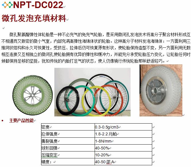 微孔聚氨酯彈性體輪胎是一種不必充氣的免充氣輪胎,是采用微閉孔發泡技術將高分子聚合材料形成互不相通而又致密的微小氣室,內部充滿高彈性海綿體狀的輪胎。這種高分子材料發泡海綿體:一方面利用三維網狀結構和永久可恢復性,受擠壓、拉伸后仍可恢復原有形狀,使輪胎保持造型不變,另一方面利用無數相互連接又互相獨立的微閉孔使輪胎擁有優異的彈性和緩沖力,并能充分承受輪胎壓力變化,讓輪胎任何時候都保持足夠的堅挺,猶如傳統的內胎打足氣的狀態,使人仍像騎行傳統輪胎那樣舒適輕巧。
